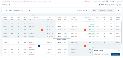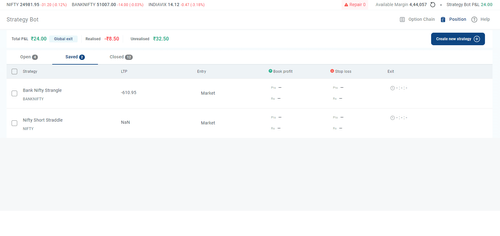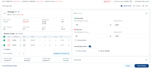 Strategy Bot is an automated multi-leg trading tool that simplifies the creation and execution of options strategies. It allows traders to add multiple option contracts and set specific entry and exit conditions based on price or time for each strategy.
