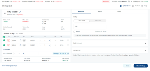 3. Strategy LTP-Based Execution The combined Strategy LTP drives the execution, which simplifies strategy management. Instead of setting entry or exit prices for each individual leg of the options contracts, traders can rely on the Strategy LTP to trigger the execution of orders. This makes it easier to manage multiple-leg strategies.