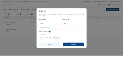 - You can set a Global Exit for all your open strategies based on overall PnL or Time, which will be applicable for the same day.