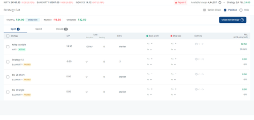 - Note : All active strategies are paused at the start of the next trading day. To resume, restart them from the “Positions” tab.