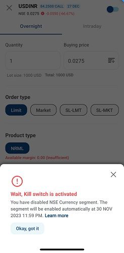 Step 5: Once a segment is disabled, order placement will be blocked until the end of the day (11.59 PM).