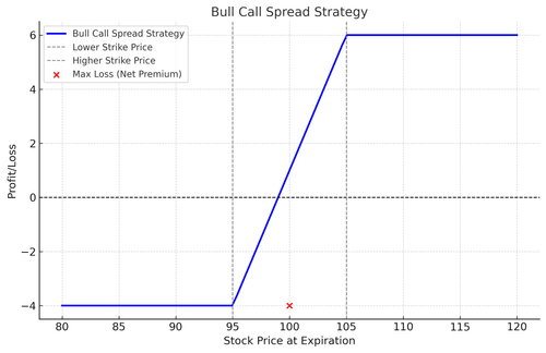 Bull Call Spread को एक कम स्ट्राइकिंग कॉल ऑप्शन खरीदकर और एक उच्च स्ट्राइकिंग कॉल ऑप्शन बेचकर निष्पादित किया जाता है, लेकिन इन दोनों की समाप्ति की तारीख एक ही होनी चाहिए। यह रणनीति स्टॉक की मूल कीमत में मध्यम वृद्धि से लाभ प्राप्त करेगी, और यह एक कॉल ऑप्शन खरीदने की तुलना में कम लागत पर ऐसा करती है।