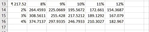 डिस्काउंट रेट (WACC): विभिन्न डिस्काउंट रेट्स (जैसे, 8%, 9%, 10%, 11%, 12%) के प्रभाव का परीक्षण करें।