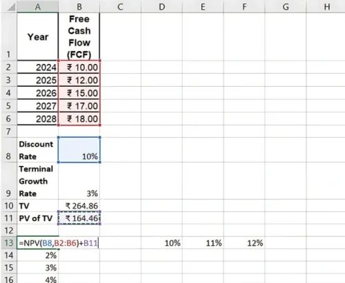 एक्सेल (Excel) ऑटोमेटिकली (automatically) प्रत्येक डिस्काउंट रेट्स (discount rates) और ग्रोथ रेट्स (growth rates) के कॉम्बिनेशन (combination) के लिए एनपीवी (NPV) की गणना करेगा, और सेंसिटिविटी टेबल (sensitivity table) को पूरा करेगा।