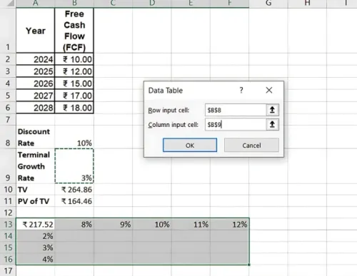 - कॉलम इनपुट सेल (Column Input Cell) के लिए, उस सेल को सेलेक्ट करें जहां टर्मिनल ग्रोथ रेट (terminal growth rate) एंटर किया गया है।