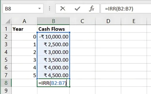 यहाँ, B2:B7 नकद प्रवाह (cash flows) की रेंज को दर्शाता है।