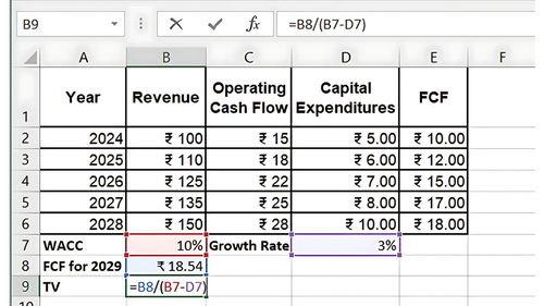 FCFₙ₊₁ = पूर्वानुमान अवधि के बाद के वर्ष में फ्री कैश फ्लो (2029)।