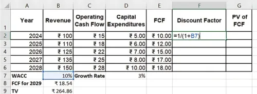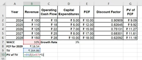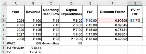 अब, हम एफसीएफ (FCFs) और टर्मिनल वैल्यू को वापस उनके प्रेज़ेंट वैल्यू में डिस्काउंट करेंगे, 10% के डब्ल्यूएसीसी (WACC) का उपयोग करके।