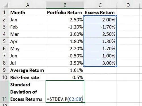 स्टेप 5: एक्सेस रिटर्न्स (excess returns) का स्टैंडर्ड डेवीएशन (standard deviation) कैल्कुलेट करें