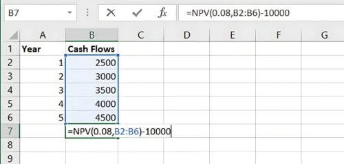 - रिजल्ट: पॉजिटिव या नेगेटिव वैल्यू जो इन्वेस्टमेंट के NPV को दर्शाता है। यहाँ, 0.08 डिस्काउंट रेट (discount rate) को दर्शाता है, और B2:B6 भविष्य के कैश फ्लो (cash flows) की रेंज को दर्शाता है। फाइनल NPV प्राप्त करने के लिए शुरुआती इन्वेस्टमेंट को घटाएं।
