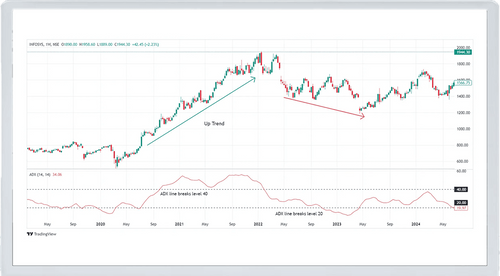 मान लो Infosys एक स्थिर अपट्रेंड में है, लेकिन ADX वैल्यू 40 से ऊपर बढ़ने लगती है, जो एक strong trend का संकेत देती है। उसी समय, +DI -DI से ऊपर है, यह पुष्टि करते हुए कि बुलिश ट्रेंड बरकरार है। एक ट्रेडर इस जानकारी का उपयोग अपनी लंबी स्थिति को बनाए रखने के लिए कर सकता है, यह विश्वास रखते हुए कि ट्रेंड के पास ऊपर की ओर बढ़ने के लिए पर्याप्त मोमेंटम है।