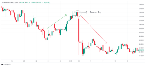 मान लीजिए Reliance Industries एक स्थिर अपट्रेंड में है, लेकिन फिर दो लगातार कैंडल्स लगभग समान हाईज़ के साथ बनती हैं, जो एक ट्वीज़र टॉप (Tweezer Top) बनाती हैं। यह संकेत देता है कि खरीदारों ने प्राइस को जितना ऊपर ले जा सकते थे ले लिया है, और अब विक्रेता नियंत्रण में आ रहे हैं। ट्रेडर्स इसे इस संकेत के रूप में देख सकते हैं कि अपट्रेंड खत्म हो चुका है और एक बेयरिश रिवर्सल (bearish reversal) आने वाला है।