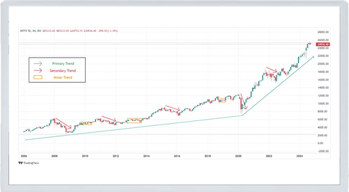 - प्राइमरी ट्रेंड (Primary Trend): यह मार्केट की मुख्य दिशा होती है और महीनों या यहां तक कि सालों तक चलती है। यह या तो एक अपट्रेंड (uptrend) (बुल मार्केट) या डाउनट्रेंड (downtrend) (बियर मार्केट) हो सकती है।