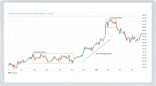 - डिस्ट्रिब्यूशन फेज़ (Distribution Phase): यह फाइनल स्टेज होती है, जहां अनुभवी इन्वेस्टर्स अपने पोजीशन को प्रॉफिट लॉक करने के लिए बेचना शुरू करते हैं। व्यापक पब्लिक अभी भी खरीद रही हो सकती है, लेकिन ट्रेंड अपने अंत के करीब होता है।