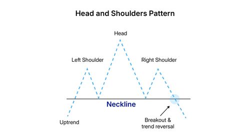 हेड एंड शोल्डर्स (Head and Shoulders) पैटर्न एक क्लासिक बियरिश रिवर्सल पैटर्न (bearish reversal pattern) है जो अपट्रेंड के अंत का संकेत देता है। इसमें तीन पीक्स होते हैं: एक उच्च पीक (हेड) दो छोटे पीक्स (शोल्डर्स) के बीच, और एक नेकलाइन जो दो शोल्डर्स के लो को जोड़ती है। जब प्राइस नेकलाइन के नीचे टूटता है, तो यह एक नए डाउनट्रेंड की शुरुआत का संकेत देता है।
