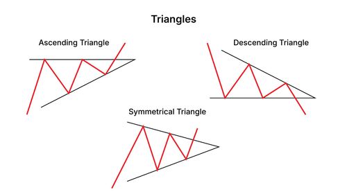 - ट्रायंगल्स: सिमेट्रिकल, एसेंडिंग, या डिसेंडिंग ट्रायंगल्स जो यह सुझाव देते हैं कि कीमतें मौजूदा ट्रेंड की दिशा में ब्रेकआउट करेंगी।
