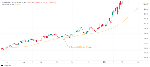 ट्रेंड कन्फर्मेशन (Trend Confirmation): व्यापारी ट्रेंड की दिशा की पुष्टि के लिए EMA का उपयोग करते हैं। उदाहरण के लिए, यदि मूल्य 50-दिन EMA (50-day EMA) के ऊपर ट्रेड कर रहा है, तो यह अपट्रेंड का संकेत देता है, जबकि नीचे ट्रेड करने पर यह डाउनट्रेंड का संकेत देता है।