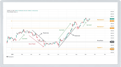उदाहरण: इंफोसिस में पिवट पॉइंट्स और ट्रेंडलाइनों का उपयोग करना