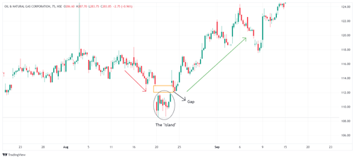 सोचिए ONGC एक डाउनट्रेंड में था, और प्राइस लगातार गिरते हुए ₹113 पर आ गया। एक दिन, स्टॉक गैप डाउन हो जाता है, ₹110 पर ओपन होता है, और अगले कुछ दिनों तक उस लेवल के आसपास कंसोलिडेट करता है, जिससे आइलैंड (island) बनता है। अचानक, स्टॉक ₹111 पर गैप अप होकर आइलैंड रिवर्सल पैटर्न (Island Reversal Pattern) पूरा करता है। यह एक बुलिश रिवर्सल (bullish reversal) का संकेत है, और ट्रेडर्स एक बाय (buy) पोजीशन में एंटर कर सकते हैं, उम्मीद करते हुए कि प्राइस और बढ़ेगा।
