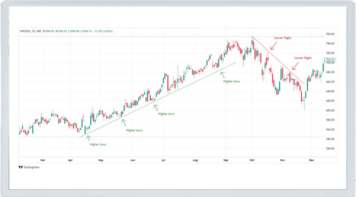 मार्केट में ट्रेंड्स को पहचानना सूचित ट्रेडिंग निर्णय लेने के लिए महत्वपूर्ण है। जैसे ट्रैफिक के फ्लो को फॉलो करने से आप अपनी मंजिल तक सुरक्षित पहुंचते हैं, वैसे ही स्टॉक के प्राइस के फ्लो को फॉलो करने से आप बेहतर इन्वेस्टमेंट निर्णय ले सकते हैं। ज्यादातर ट्रेडर्स अपट्रेंड (uptrend) के दौरान खरीदना (buy) और डाउनट्रेंड (downtrend) के दौरान बेचना (sell) पसंद करते हैं। ऐसा करके, वे अपने ट्रेड्स को मार्केट की व्यापक दिशा के साथ संरेखित करते हैं, जिससे आवेगी निर्णय लेने का रिस्क (risk) कम होता है।