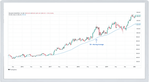 मूविंग एवरेजेस (moving averages) रोज़ाना की प्राइस फ्लक्चुएशंस (price fluctuations) को स्मूद बनाने में मदद करता है, जिससे ट्रेंड्स को देखना आसान हो जाता है। एक 50-डे मूविंग एवरेज (50-day moving average) पिछले 50 दिनों की औसत प्राइस को कैलकुलेट करता है। अगर स्टॉक प्राइस मूविंग एवरेज के ऊपर है, तो यह अपट्रेंड (uptrend) को दर्शाता है। अगर यह नीचे है, तो यह डाउनट्रेंड (downtrend) का संकेत हो सकता है।