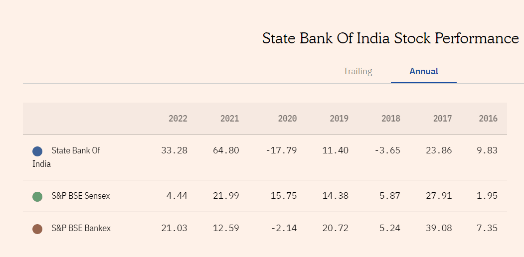 SBI is the banker to every Indian, a title earned through years of dedicated service and vast presence. As per its annual report 2022-23, the bank had 22,405 branches with a 22.99% market share of deposits. It has something for everyone. Whether you are a saver starting small or an investor diving into the complexities of finance, SBI has your back. Annual returns of SBI stocks stood at 33.28% in 2022, much higher than the S&P BSE Bankex at 21.03% (image below).