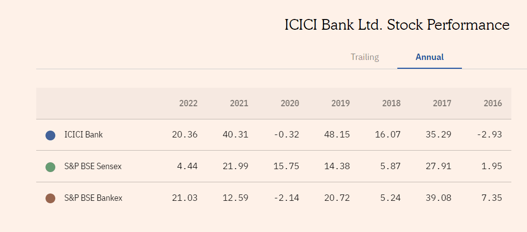 While SBI represents the public sector's stalwart presence, ICICI Bank epitomizes the dynamism and innovation of the private banking sector in India. Annual returns from ICICI Bank's stocks stood at 20.36% in 2022, slightly less than S&P BSE Bankex at 21.03%, but much higher than S&P BSE Sensex at 4.44% (see image below).