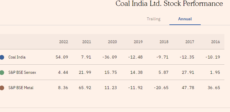 Annual returns from Coal India’s stock in 2022 stood at 54.09%.