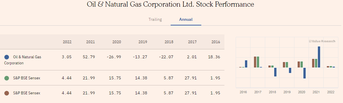 India’s largest crude oil and natural gas company, ONGC, has been instrumental in exploring and exploiting hydrocarbon resources within the country. This has led to a reduction in oil imports and increased energy self-sufficiency. Though annual returns from ONGC’s stocks were 3.05% in 2022, it was 52.79% in 2021.