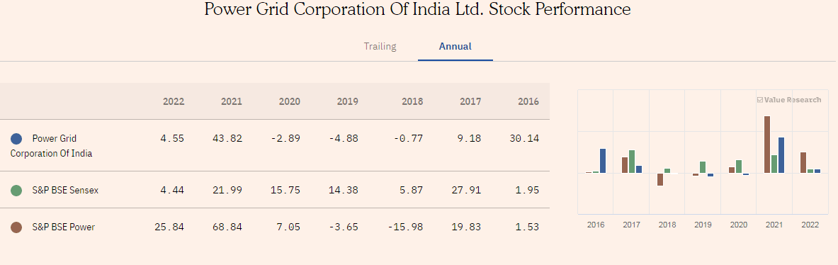 While annual returns from Power Grid of Corporation's stock stood at 4.55% in 2022, in 2021 it was 43.82%.