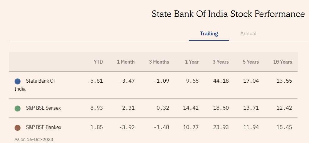 - As of 16th October 2023, 3-year trailing returns of SBI stocks stood at 44.18%