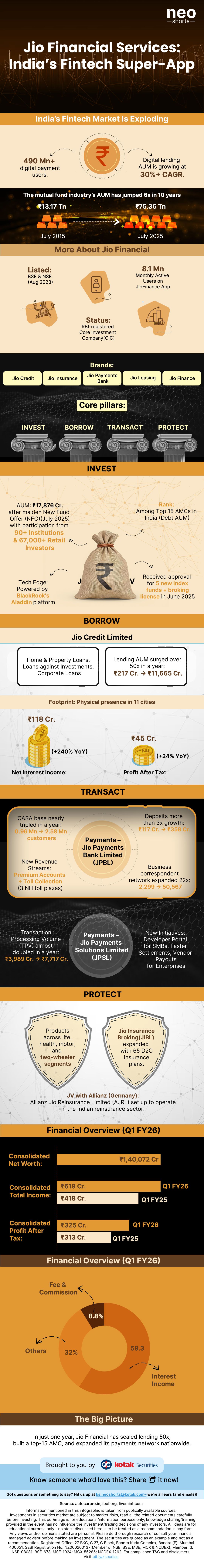 Listed on the stock exchanges in August 2023, Jio Financial is structured as an RBI-registered Core Investment Company and today houses brands like Jio Credit, Jio Insurance, Jio Payments Bank, Jio Leasing, and the Jio Finance app.