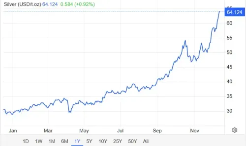 Prices have climbed 103% year-on-year and have crossed into the high fifty-dollar zone, with brief spikes above 59 dollars an ounce.