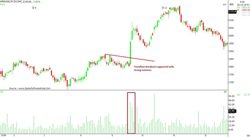 On occasions, one might be too eager in entering a trade on trendline breakout. However, identifying a perfect trendline breakout requires years of experience. In a trendline breakout, a massive surge in volume (SEE HUL CHART) confirms a major positive upside that can push the price over 10 per cent higher in a short span of time.