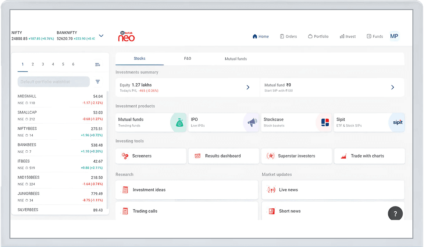 The dashboard is your main control centre. Here, you can see an overview of your investments, including your equity holdings and mutual funds. The investments summary gives you a quick glance at your portfolio's value and performance.