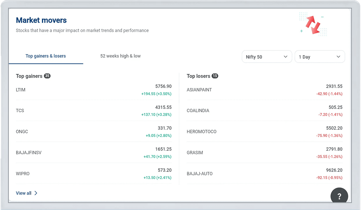 In this section, you can see the top gainers and losers in the market. This helps you understand which stocks are performing well and which are not.