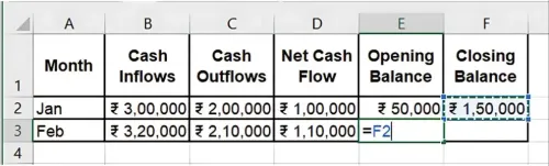 Closing Balance: Add the Opening Balance to the Net Cash Flow. =Opening Balance + Net Cash Flow