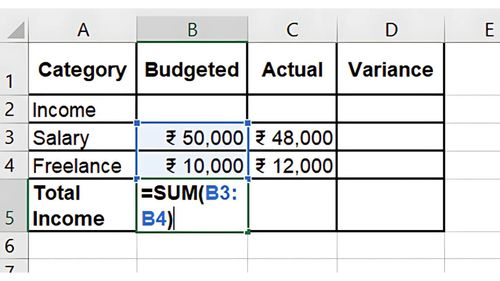 - For Variance: Calculate the difference between Budgeted and Actual with =Budgeted - Actual.