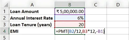 Excel’s PMT function simplifies the calculation of EMI, helping you assess home loan affordability.