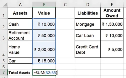 In Excel, sum up the total value of your assets and liabilities using the SUM function: