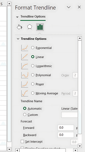 Excel will calculate the slope and intercept, projecting the trend line based on historical data.