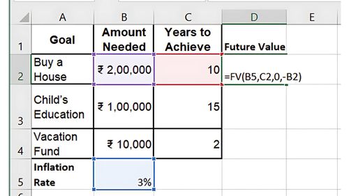 If the goal is long-term, consider how inflation will affect the amount you need to save. Use the FV (Future Value) function to calculate how much you’ll need in the future. Assume an inflation rate of 3%.