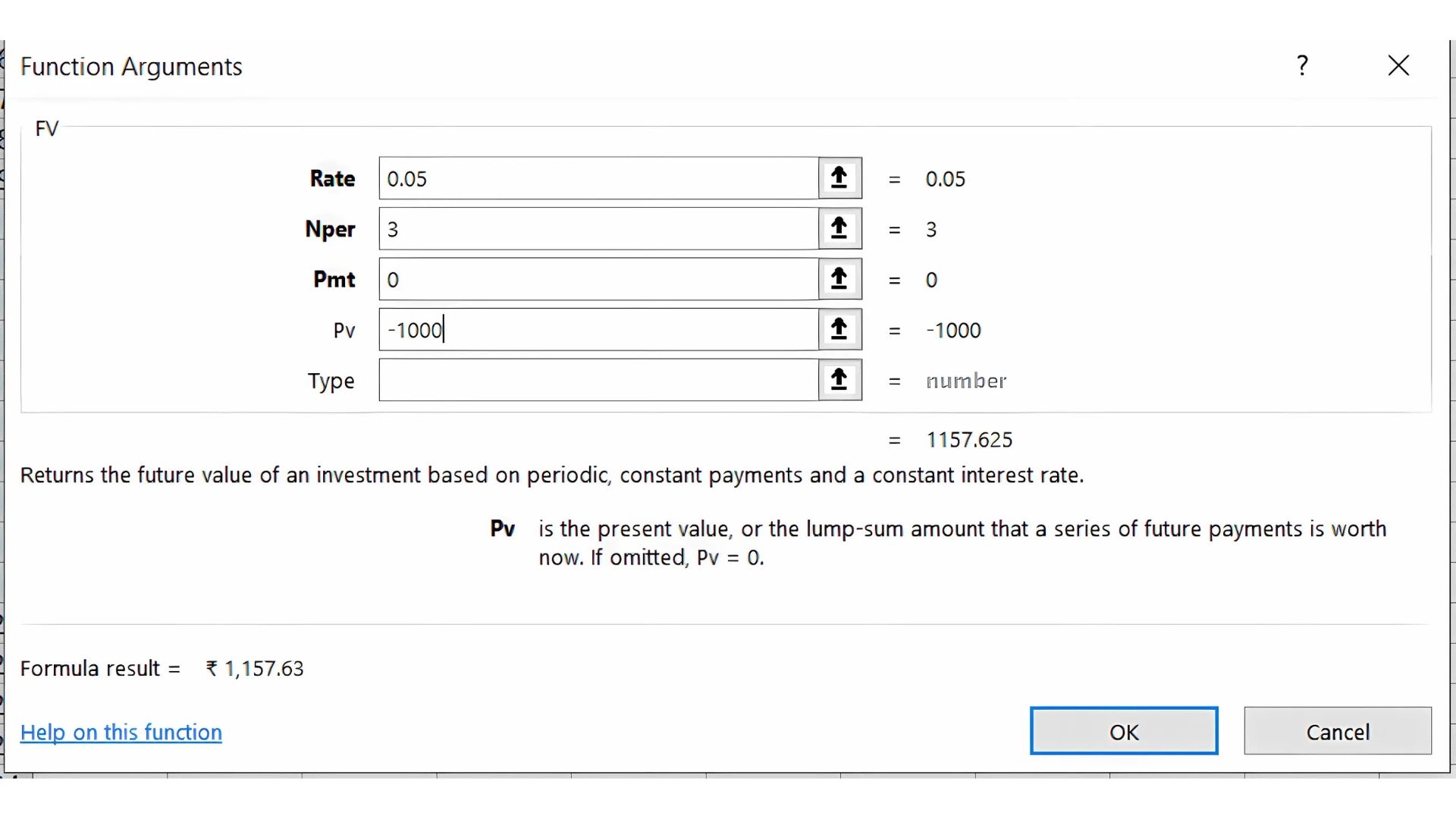 =FV(0.05, 3, 0, -1000)
