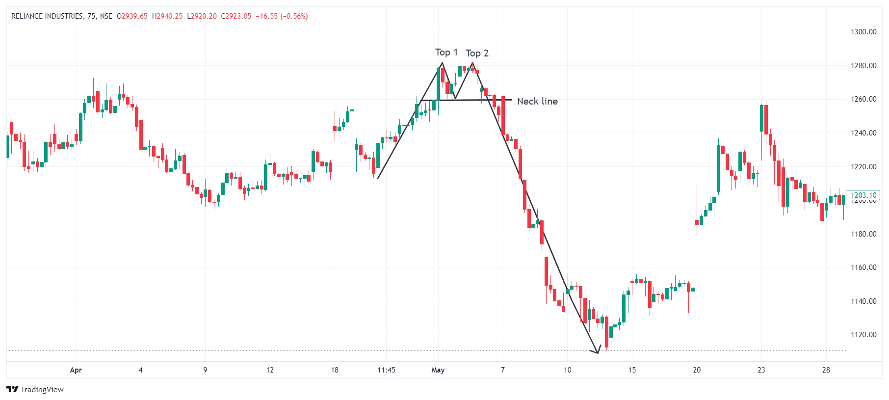Imagine Reliance Industries is in a prolonged uptrend. The stock reaches a peak of ₹1280, declines to ₹1260, and then rises back to ₹1280. However, it fails to break through ₹1260 a second time. When the price falls below ₹1240, the Double Top pattern is confirmed, indicating a bearish reversal. This signals traders to either sell or consider shorting the stock as the uptrend loses momentum.