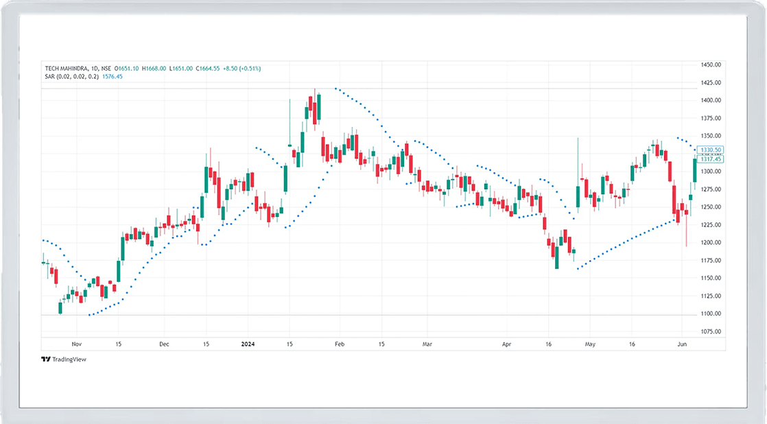 The Parabolic SAR (Stop and Reverse) is a technical indicator developed by J. Welles Wilder that helps traders identify potential trend reversals. The indicator is represented by a series of dots that appear above or below the price, depending on the trend.
