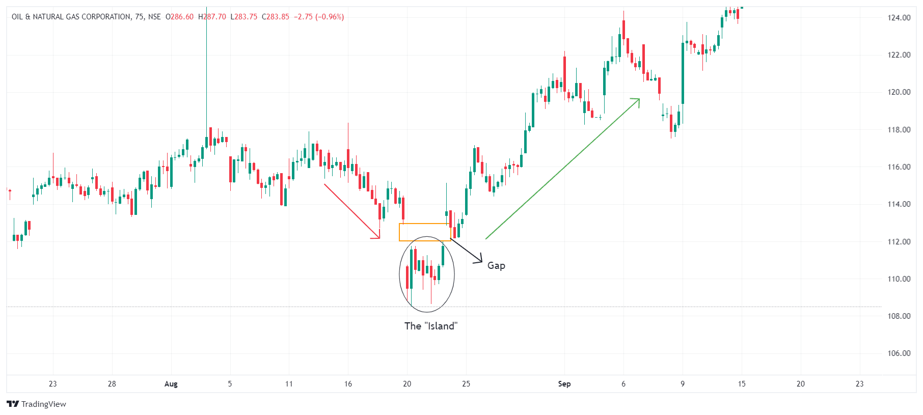Imagine ONGC has been in a downtrend, with the price falling steadily to ₹113. One day, the stock gaps down, opening at ₹110, and begins to consolidate around that level for the next several days, forming the island. Suddenly, the stock gaps up to ₹11, completing the Island Reversal Pattern. This signals a bullish reversal, and traders may enter a buy position, expecting the price to rise further.