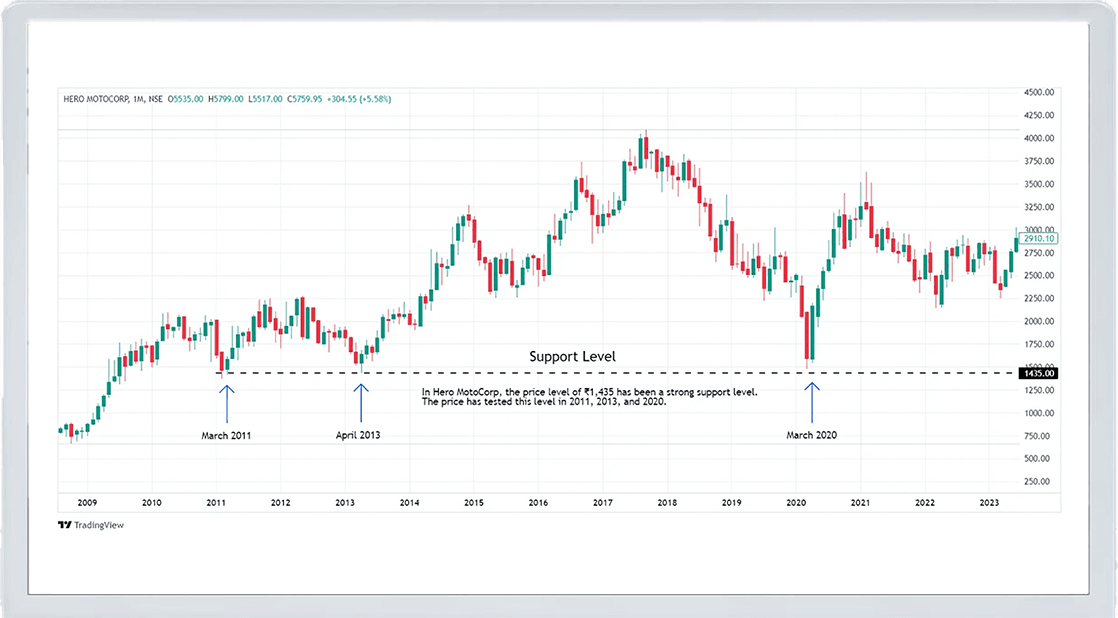 Let’s continue with Tata Motors' example. Suppose you’ve been observing the stock, and you notice that every time it falls to ₹400, it bounces back up. This tells you that ₹400 is a support level. Buyers find this price attractive and step in to buy, preventing the price from falling further.