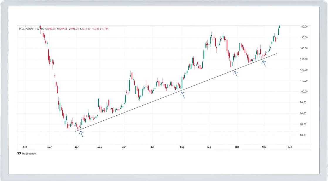 For example, if you draw a trendline connecting the higher lows of Tata Motors stock, it will show the support level where the price tends to rise after each dip.