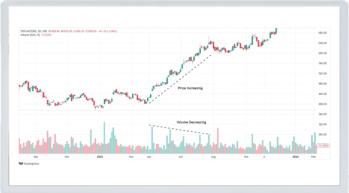 Let’s return to our Tata Motors example. Suppose Tata Motors’ stock price has been rising steadily for the past few weeks, but you notice that the volume has been decreasing. This could be a sign that the uptrend is losing strength, and a reversal may be around the corner. You might decide to hold off on buying more shares or even sell your current holdings to lock in profits.