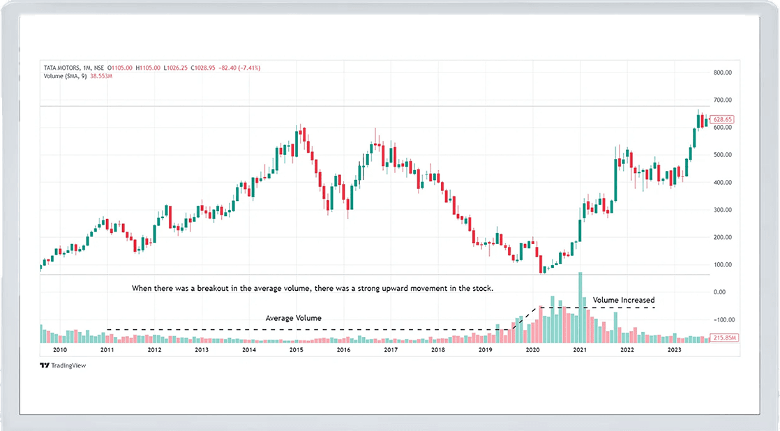On the other hand, if you observe a volume spike as Tata Motors breaks through a resistance level, it confirms that the breakout is genuine, and you may decide to buy more shares, expecting the price to continue rising.